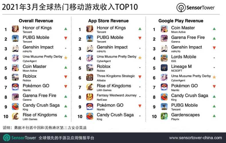 Sensor Tower 商店情报数据显示,2021年3月腾讯《王者荣耀》在全球App Store和...